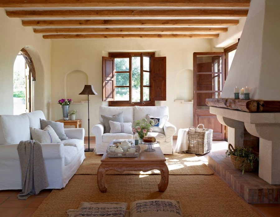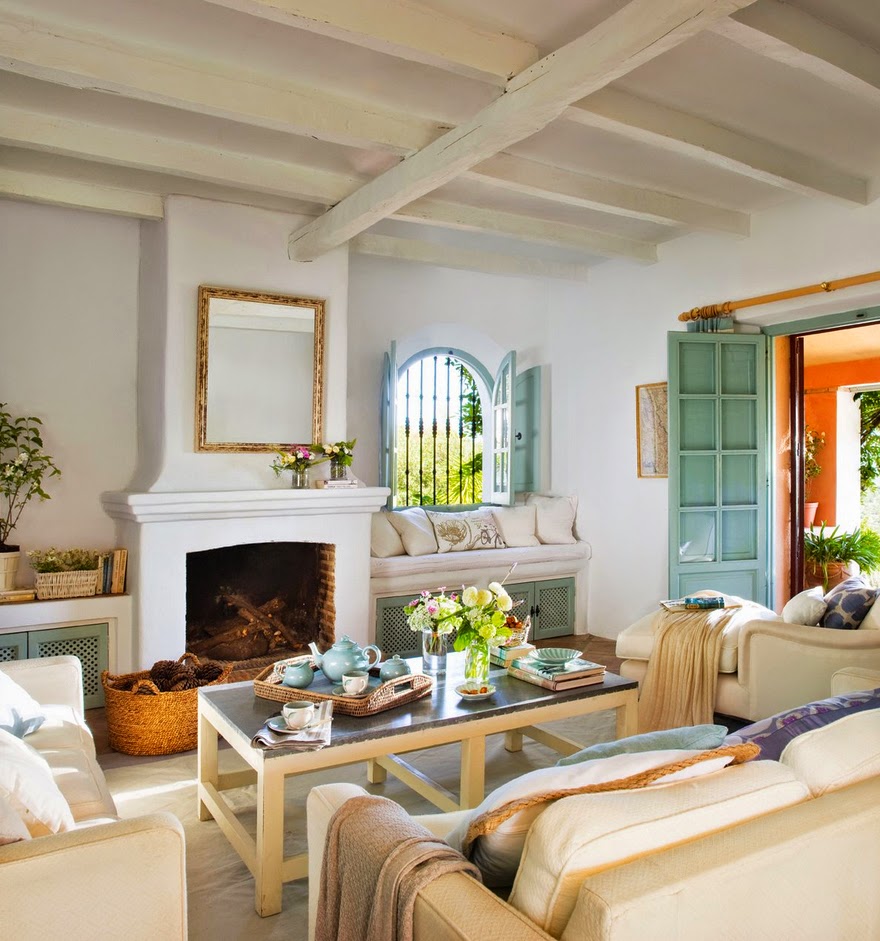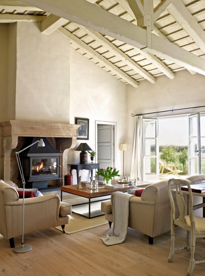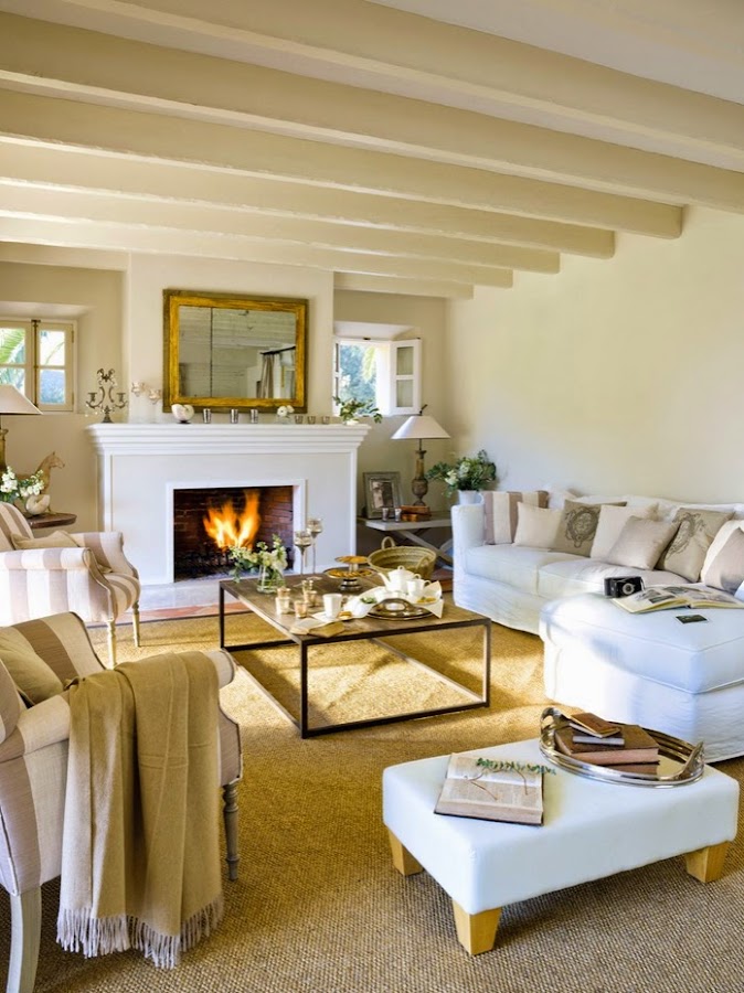 Sábado por la mañana, frió y sol, hoy quiero inspiraros con varios salones que tienen ángel, son todos acogedores, cómodos, bonitos, salones en los que apetece quedarte. Salón con chimenea todo muy natural, las vigas se han aclarado con pintura blanca decapando para que salga el color de madera natural, la chimenea esta decorada con unos farolillos sencillos y pequeñas jaulas vacías. Los jarrones ...