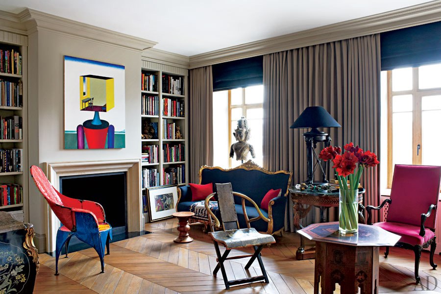 El arquitecto ruso Dimitry Velikovsky creó un look refinado y exótico para su atico de Moscú, cuya sala de estar cuenta con un sofá de madera dorada antigua, un sillón senegales y una silla de samurai del siglo XVIII