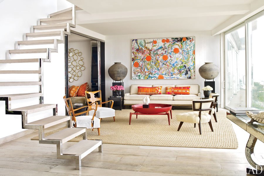 "La vista es tan abrumadora que sentía la necesidad de llenar el espacio de color y textura", La alegría del espacio proviene de varias piezas caprichosas, incluyendo una escultural silla Marc Newson y una mesa de Andrea Salvetti