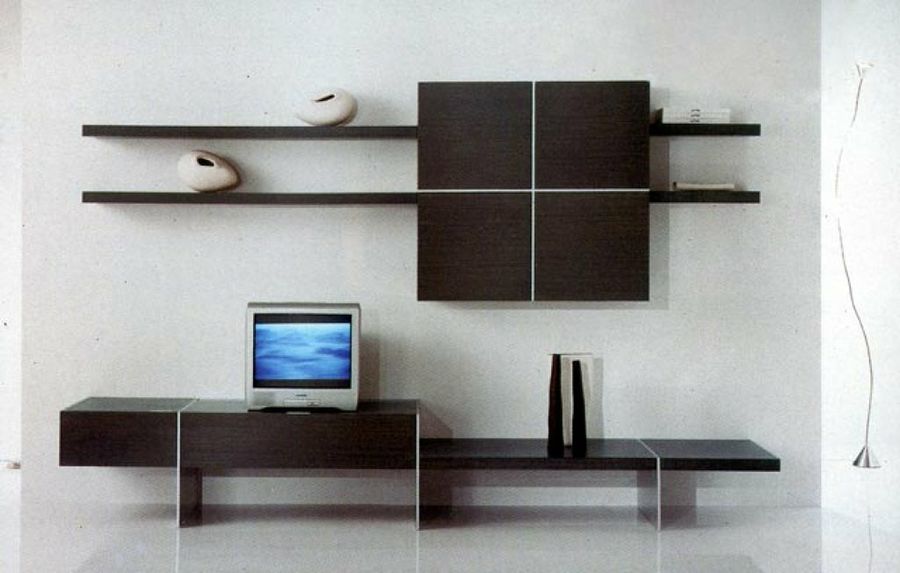 El mueble mural en los salones ha pasado a mejor vida. Si queremos estar a la última, los módulos ligeros serán nuestra primera opción. Las piezas que discurren por la pared principal de esta estancia son partes de un puzzle que combina sabiamente colores y líneas estilizadas. El éxito de los programas modulares es su versatilidad.