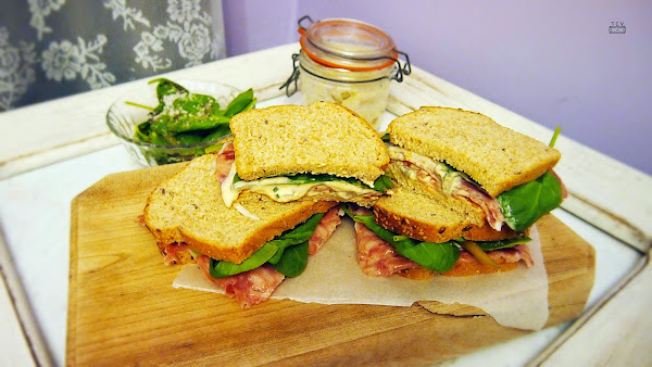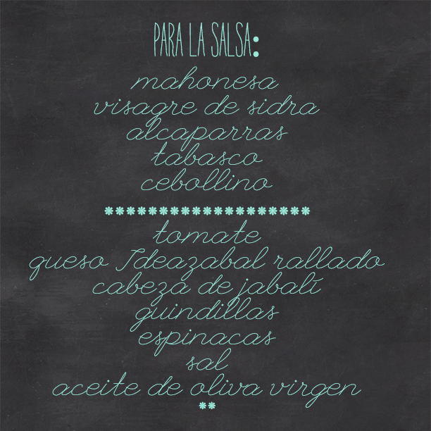 Hace unas semanas en su visita habitual de los jueves nos hizo un plato muy sencillito, Cabeza de jabalí con salsa Lasarte. Yo no me lo pensé dos veces e hice mi propia versión de la misma en plan sándwich.
