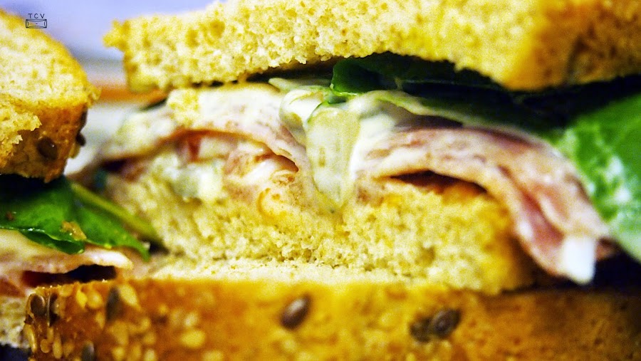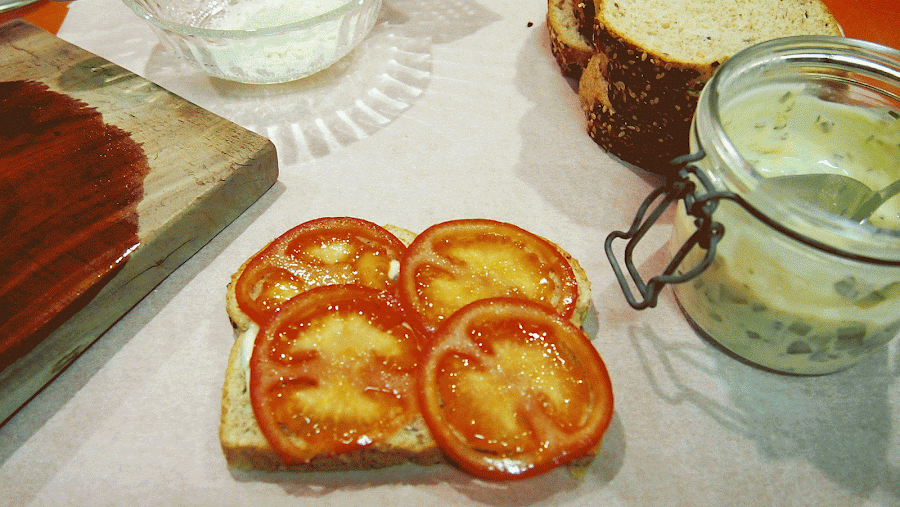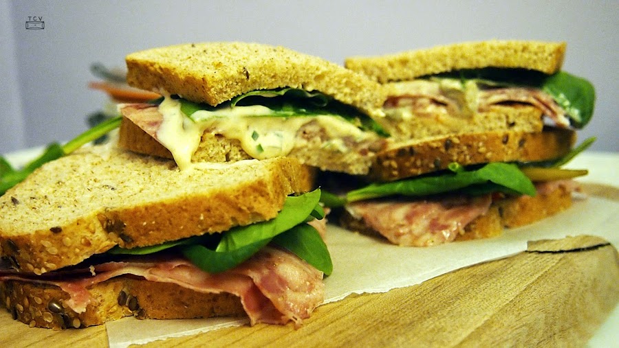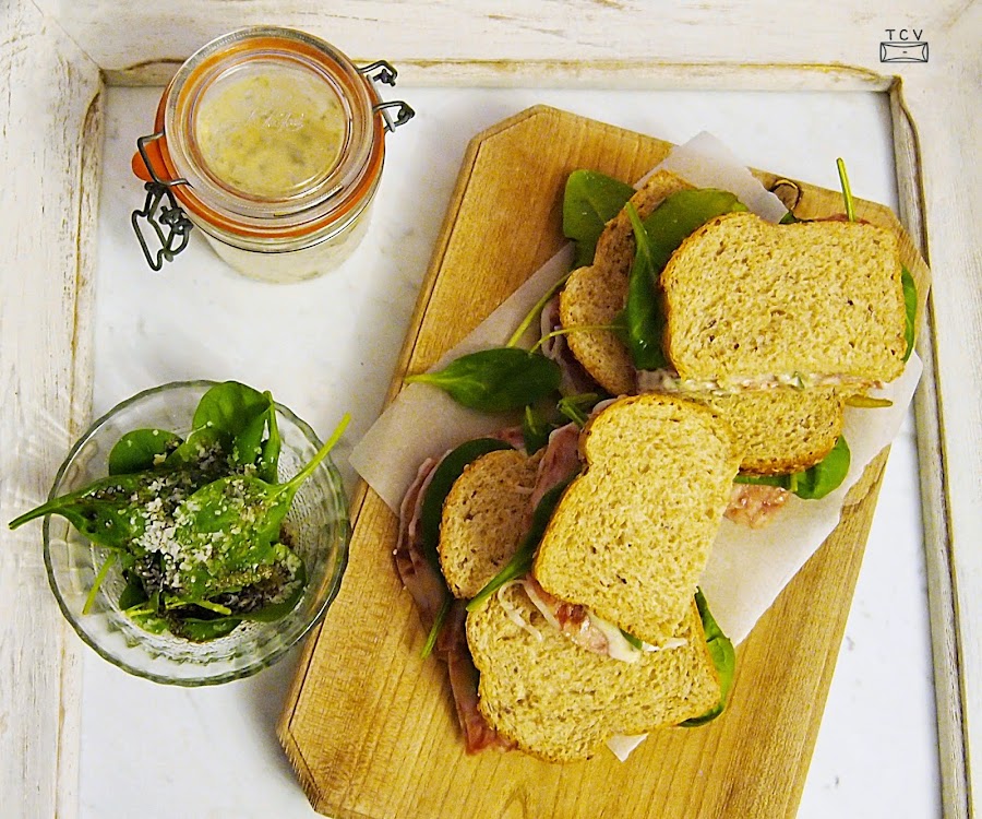 Empezamos el sándwich con una primera capa de tomate con sal, el queso, después las lonchas de cabeza de jabalí. Ahora añadimos la salsa, en plan que chorree y por último las hojas de espinacas a las que pondremos una pizca de sal y aceite de oliva virgen extra.