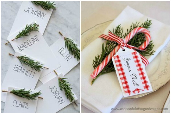 Recorta una papel con la forma que prefieras y clávale una ramita de abeto o romero. Escribe debajo el nombre de cada uno de los invitados y colócalo sobre su plato. Un bastón de caramelo sobre una ramita de abeto o romero también quedará genial. Mezclar rojos con verdes y blanco potenciará en cualquier caso a las mil maravillas el ambiente navideño. Otra idea surgiría al atar un papelito con el nombre a una piña. Resultará la mar de gracioso y natural en esta época.
