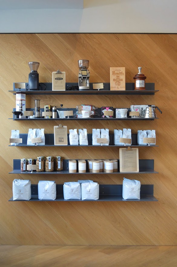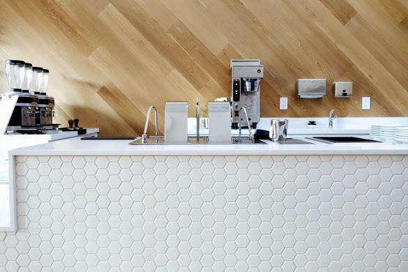 Es un diseño muy arquitectónico y mientras me documentaba sobre el espacio he descubierto que está diseñado por Amanda Loper, aquitecto. En su página podéis ver el proceso del estudio del espacio y se puede observar como la superficie de madera actúa como un forro, a media altura, y el resto del local es conservado en un blanco impoluto, que confiere aún más grandiosidad a este precioso espacio.