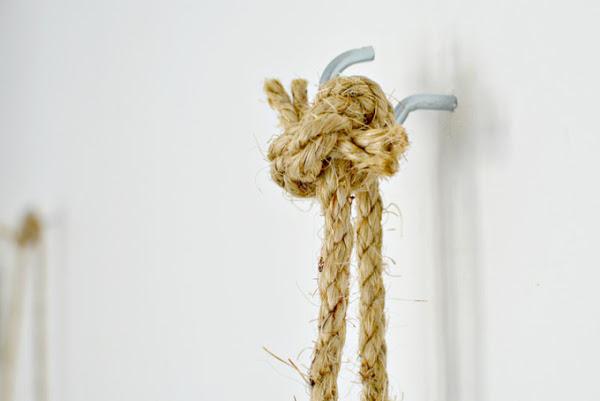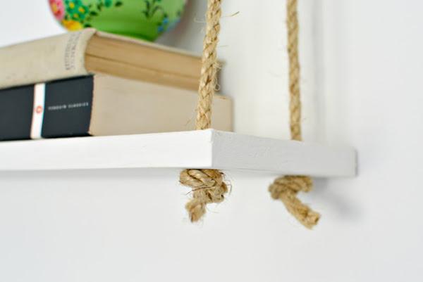 Mirar que manera más bonita de darle un punto original a un elemento tan sencillo como una balda. En lugar de colocarla de la manera habitual, lo hacemos con un par de cuerdas y el resultado es totalmente diferente y espectacular. La veo ideal para cualquier estancia, para una habitación infantil, para un baño, para poner unas macetas en una cocina. Me ha chiflado la idea.