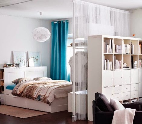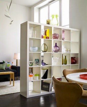 Si no quieres complicarte la vida colgando cortinas o paneles puedes simplemente colocar la estantería expedit de ikea.