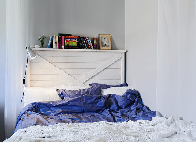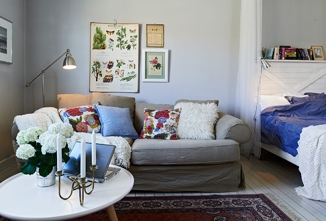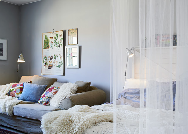 Las cortinas es un elemento que puede separar facilmente dos ambientes o usos en una misma estancia. Os traigo dos apartamentos en los que el dormitorio esa situado en el salón y se ha recurrido a este elemento para separarlo.