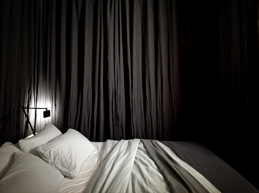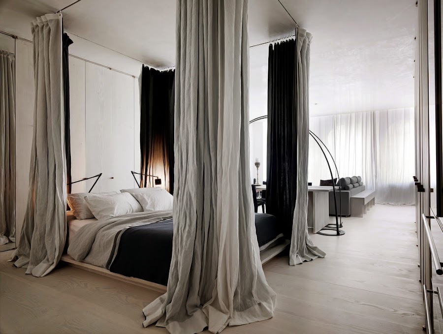 En el primer apartamento de ambiente sofisticado y moderno el dormitorio se sitúa en el centro de la estancia y las cortinas discurren alrededor de la cama a modo de gran dosel. En esta ocasión los textiles son gruesos y opacos aislando por completo la cama del salón al cerrarse.