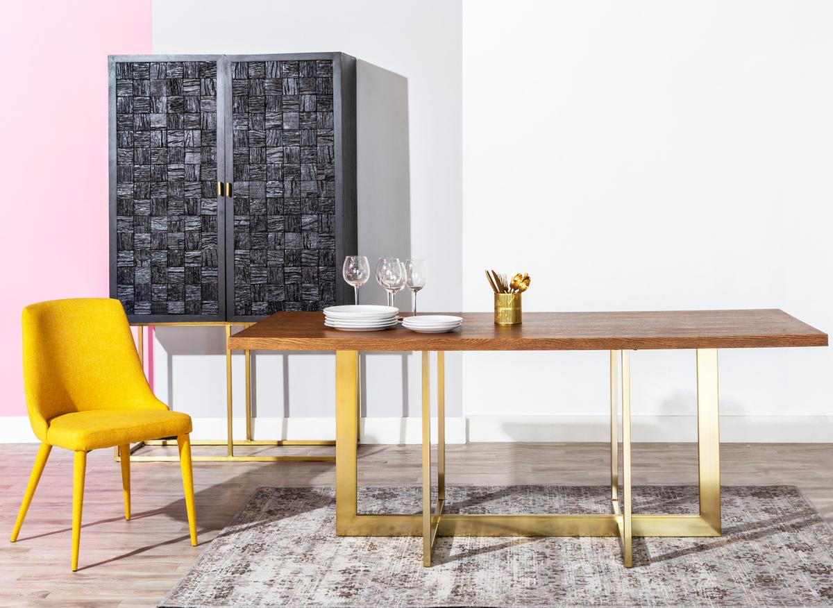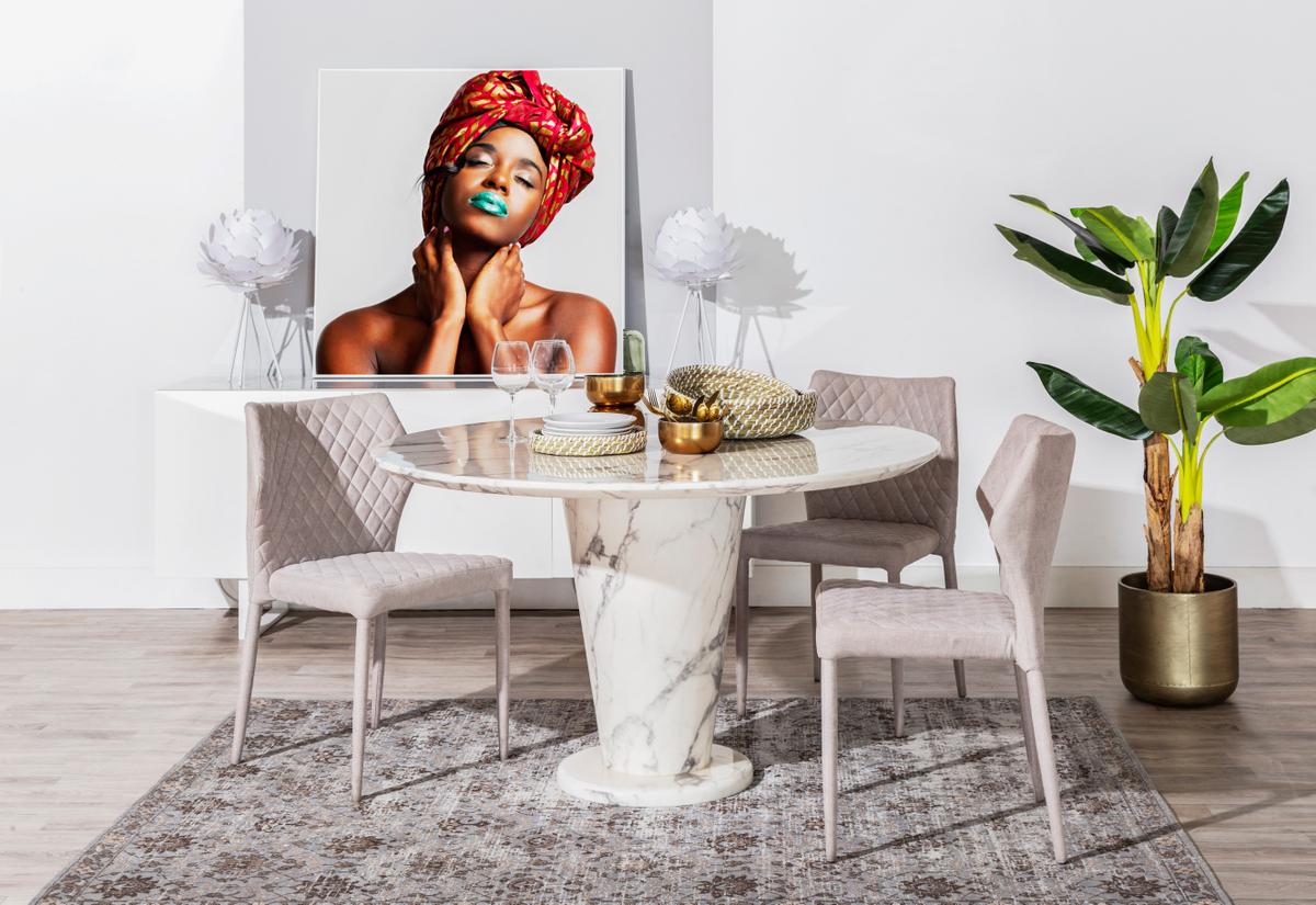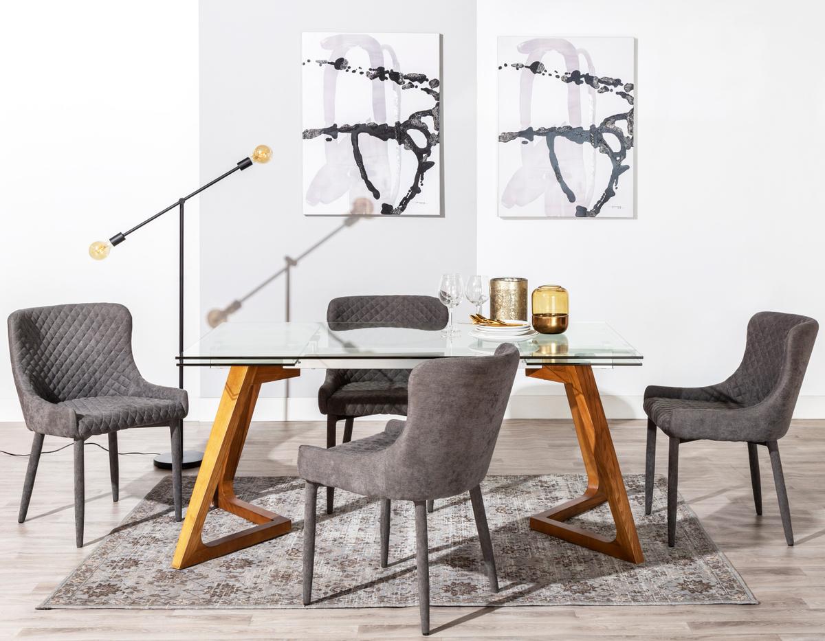 Mesa comedor que apetece probarla y disfrutarla. Junto con las sillas, la alfombra, hacen un espacio real y de confort, para comprar el ambiente al completo.