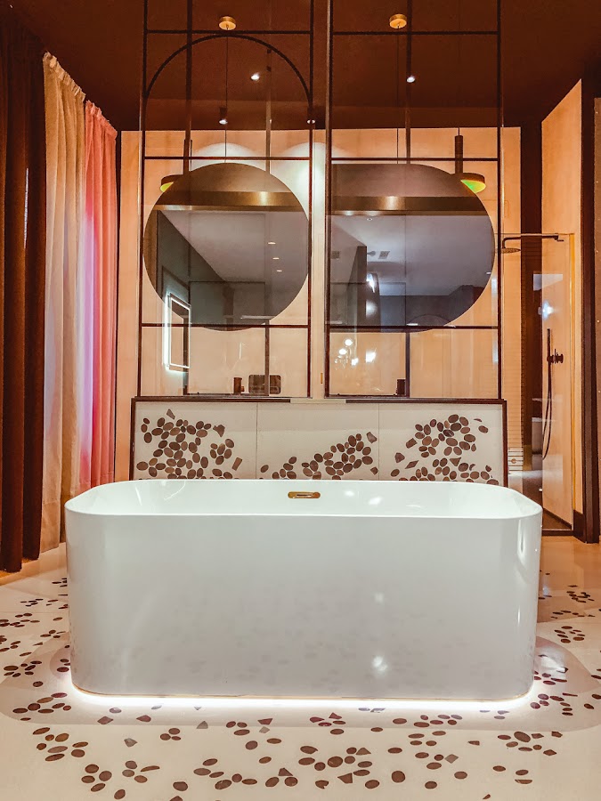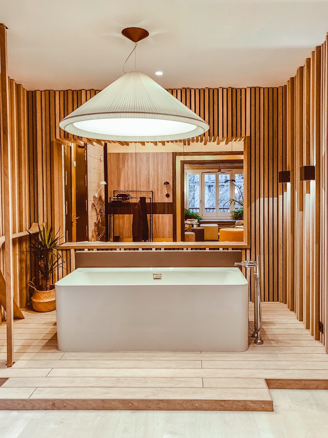 Enamorada de la bañera Finión de Villeroy & Boch y fijaos en el suelo realizado a partir de cantos rodados.