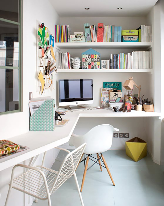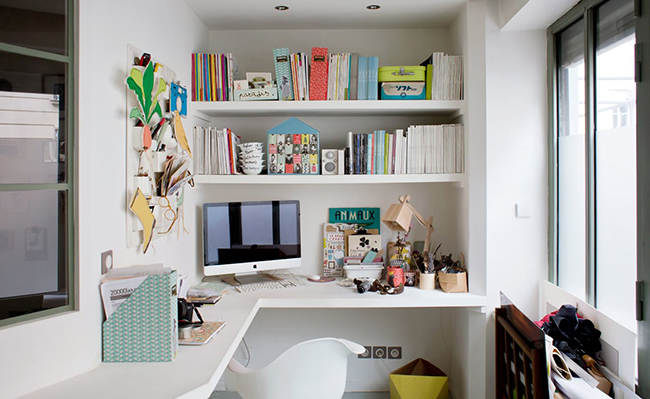 Un salón en pleno corazón de Paris con una decoración dulce, delicada pero a la vez práctica y funcional donde no solo vemos un salón sino que además ha un rincón de lectura con una mecedora Eames color mostaza protagonista total y que se integra a la perfección con el despacho compartido al fondo de esta estancia que no deja indiferente a nadie.
