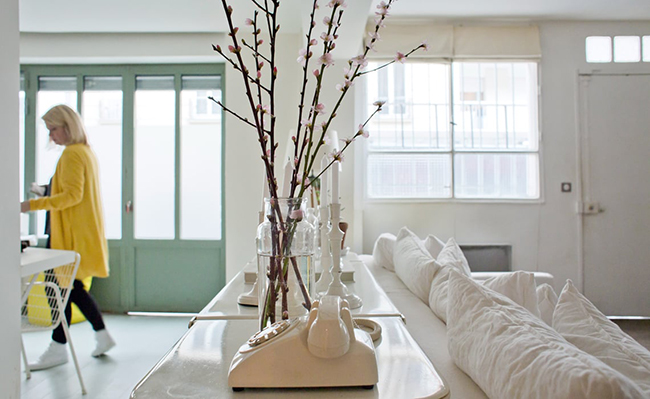 Si tienes una espacio amplio, en forma de L, no sabes como distribuirlo o quieres integrar un despacho este salón parisino te va a dar muchísimas ideas de como conseguir un look bonito y singular