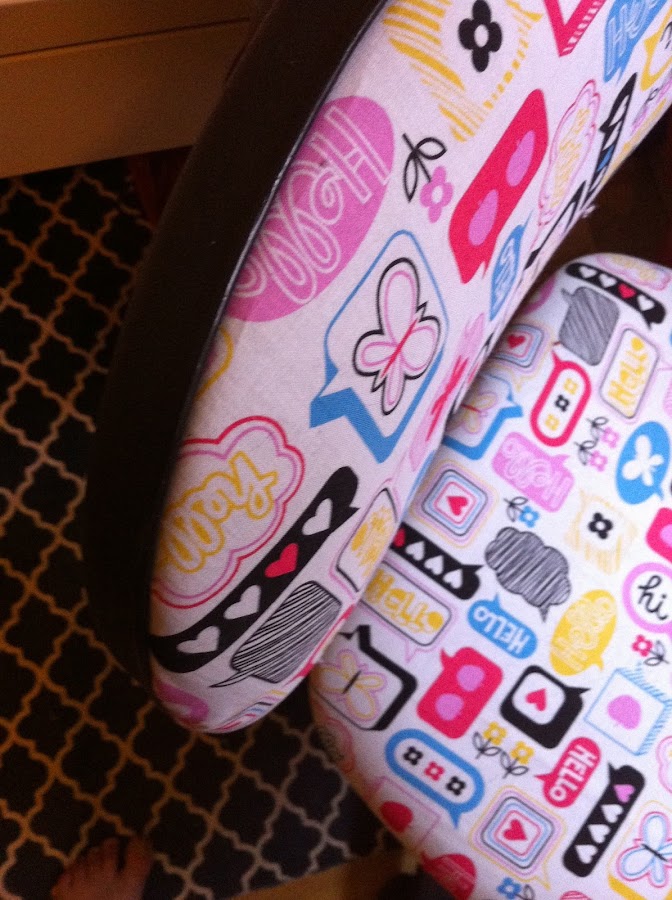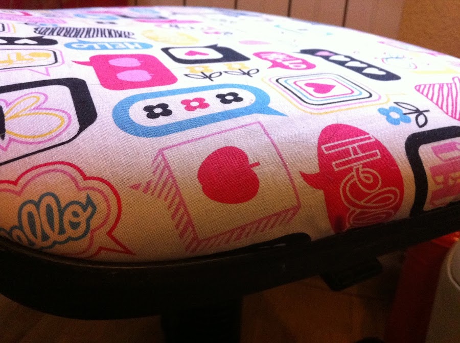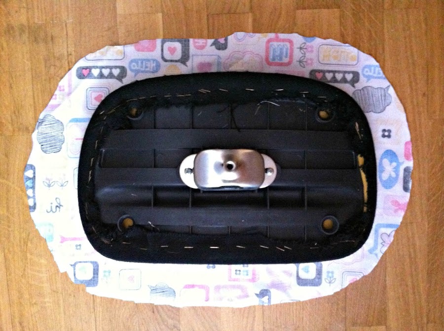 Con el asiento hay que repetir la misma operación pero sin sacarlo (porque no se puede). Así que medir la tela encima y cuando lo terminéis, ponerlo encima, arremeter la tela, apretar la goma y esconder el remate de la goma en la carcasa de plástico.