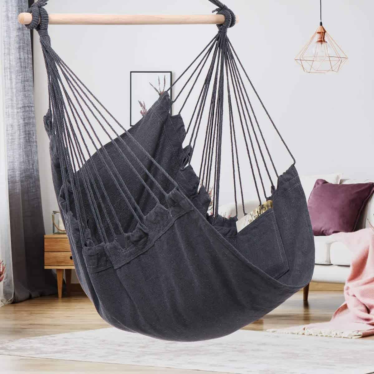 Fuente: commonsensewithmoneySilla colgante tipo hamaca. Fabricada con un tejido de algodón de muy alta cálida. Es cómoda y duradera. Es lo suficientemente grande para tener espacio suficiente para estirarse y relajarse.