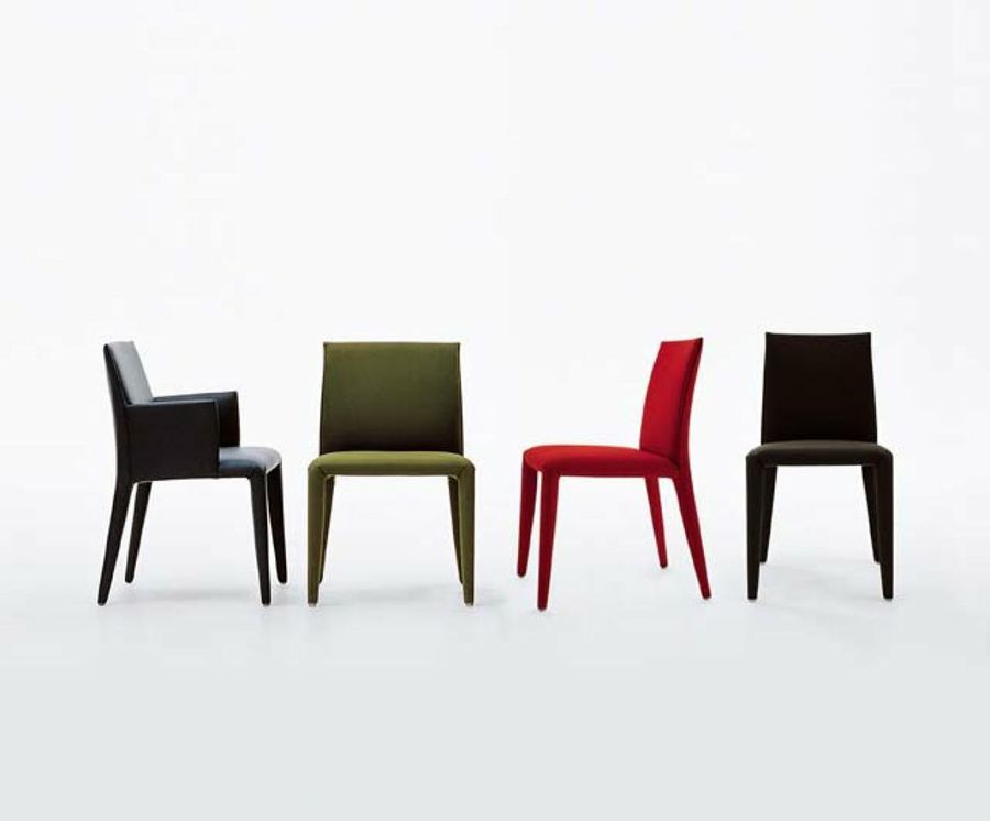 Otros diseños de G. Carollo para Porada son las sillas Eleonora y Olivia, ambas revestidas en unas telas especiales elaboradas exclusivamente para esta colección. Tienen una estructura simple: se sustentan sobre dos anchas patas laterales tapizadas en el mismo material que el respaldo, así, no hay discontinuidad entre éstas y el asiento.