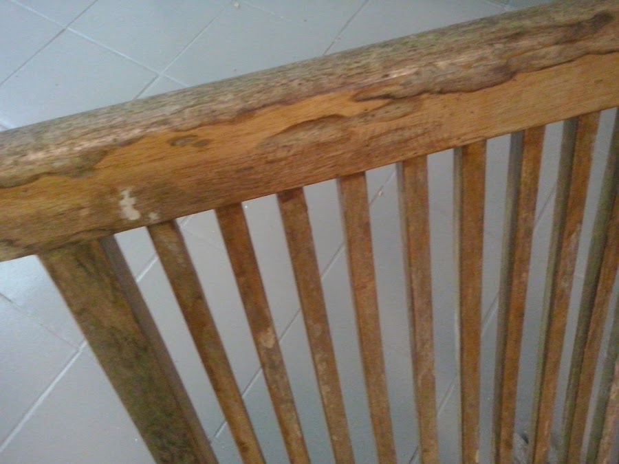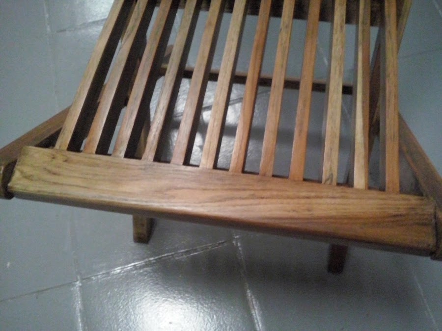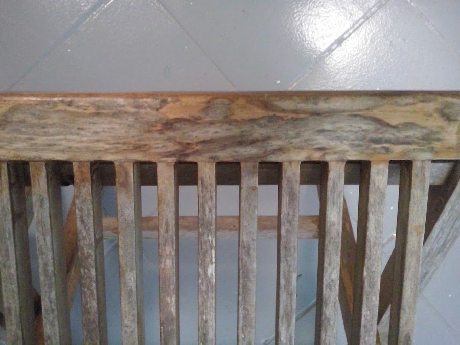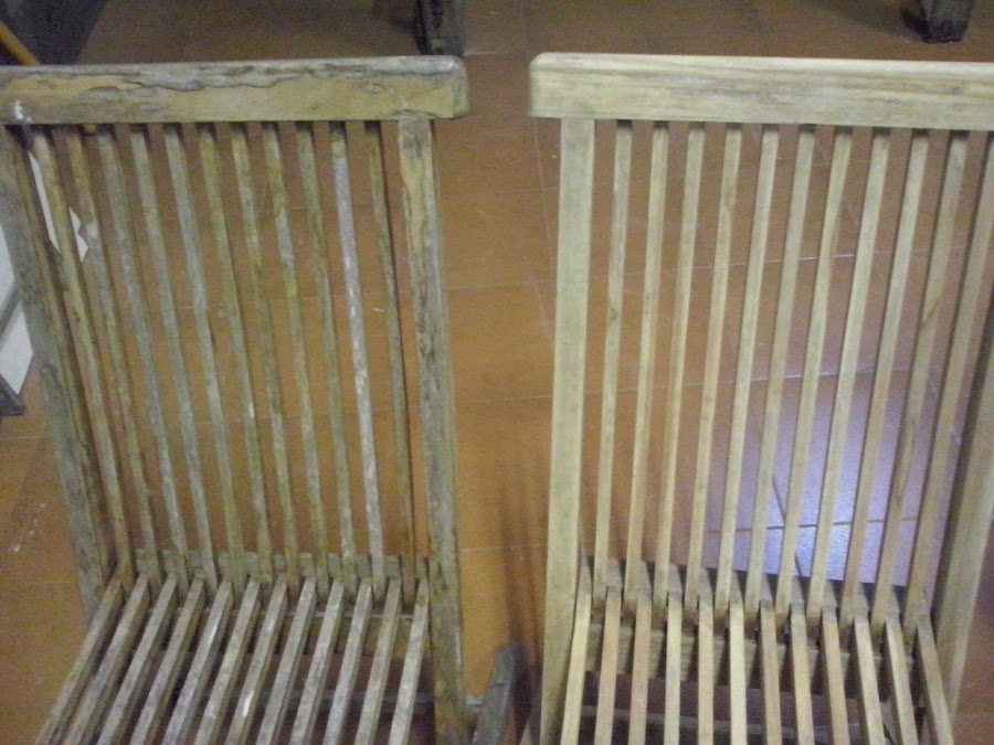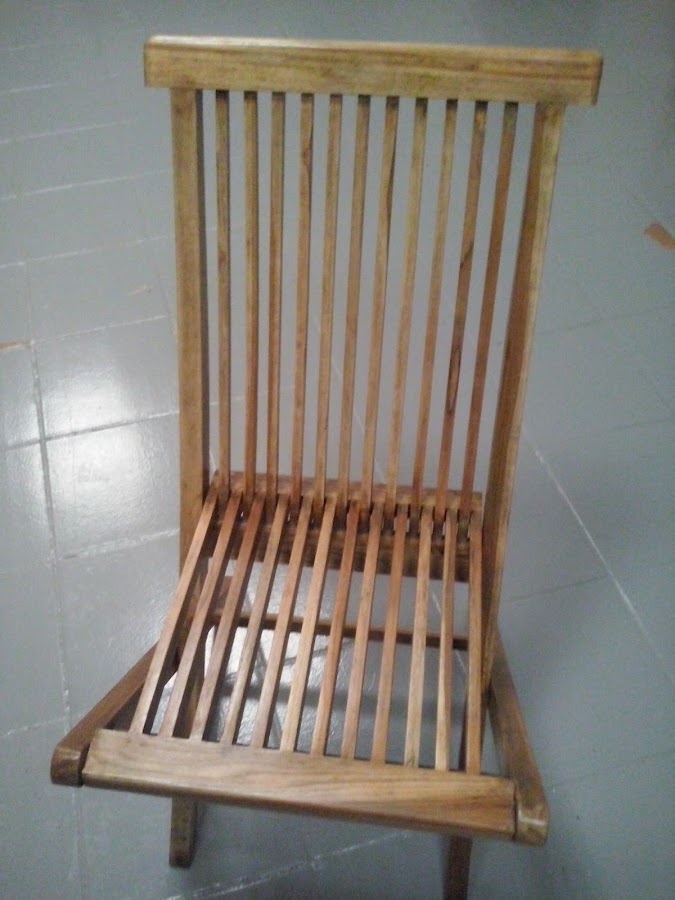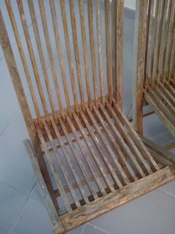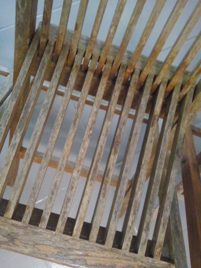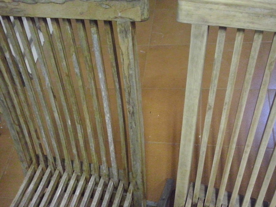 Se trata de unas sillas plegables de exterior en madera, han sido expuestas a temperaturas extremas, tanto demasiado sol, como frío invernal, con lo que el deterioro de las mismas, se puede apreciar en las imágenes.