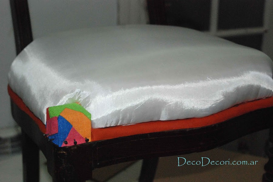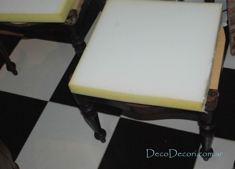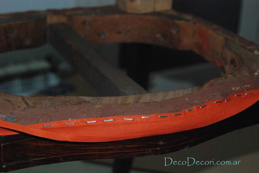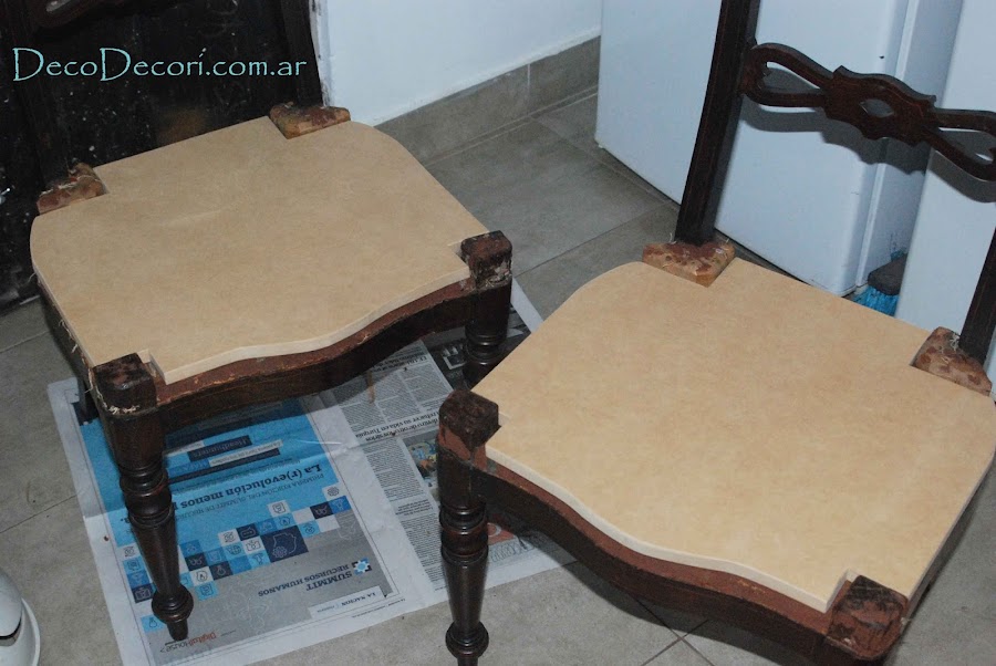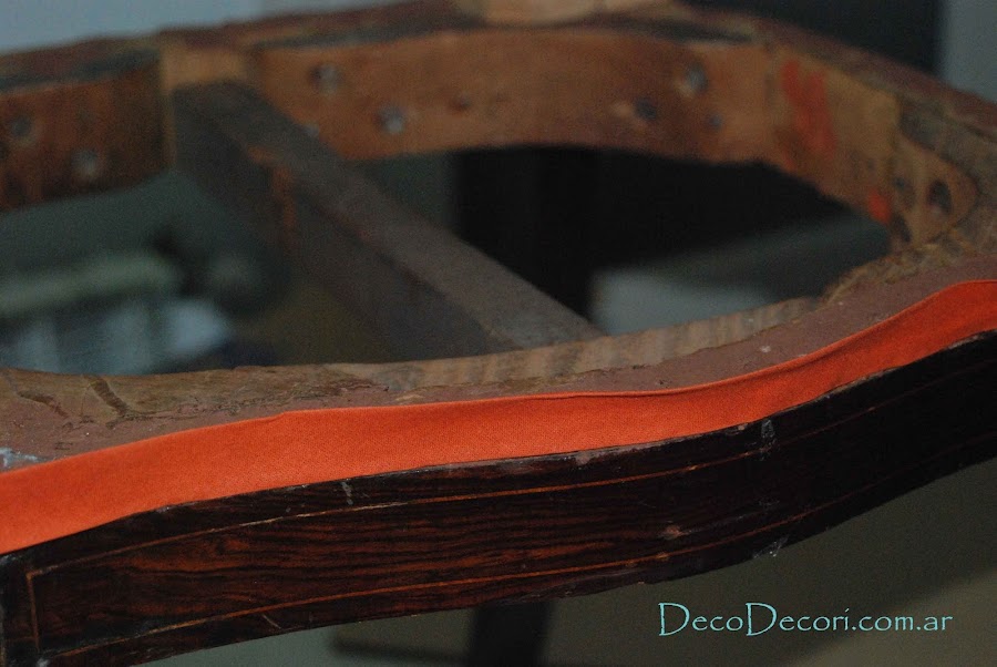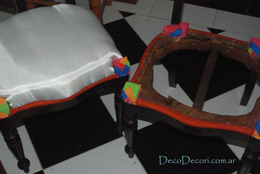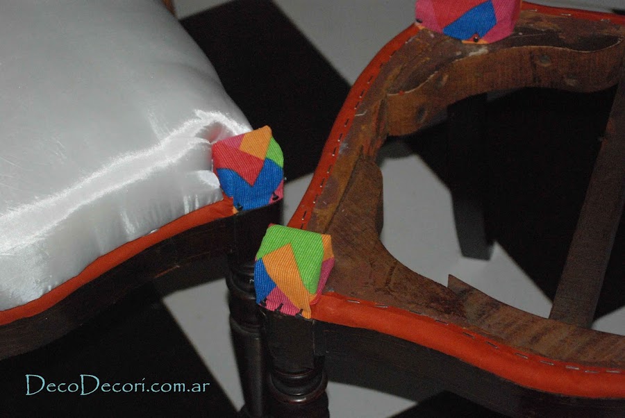 Como les contaba estas sillas antes tenían resortes y luego el tapizado, por lo que tuve que buscar la forma de rematar los extremos de madera que quedaba expuestas en las esquinas.