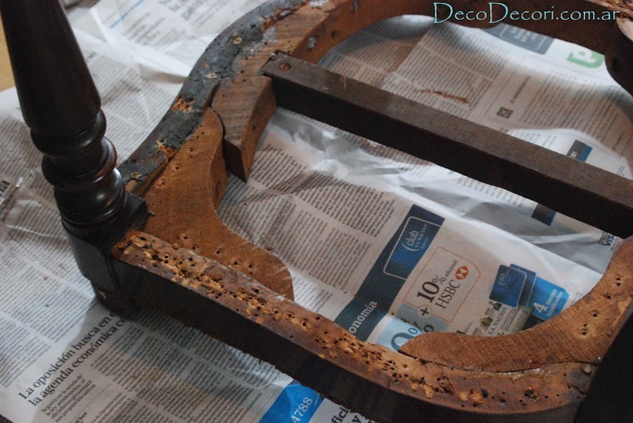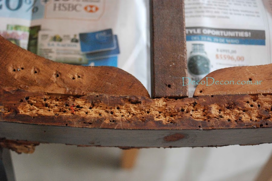 Acá se puede apreciar el paso que dejaron los insectos en la madera. Entre esos agujeros más los producidos por el tapizado.