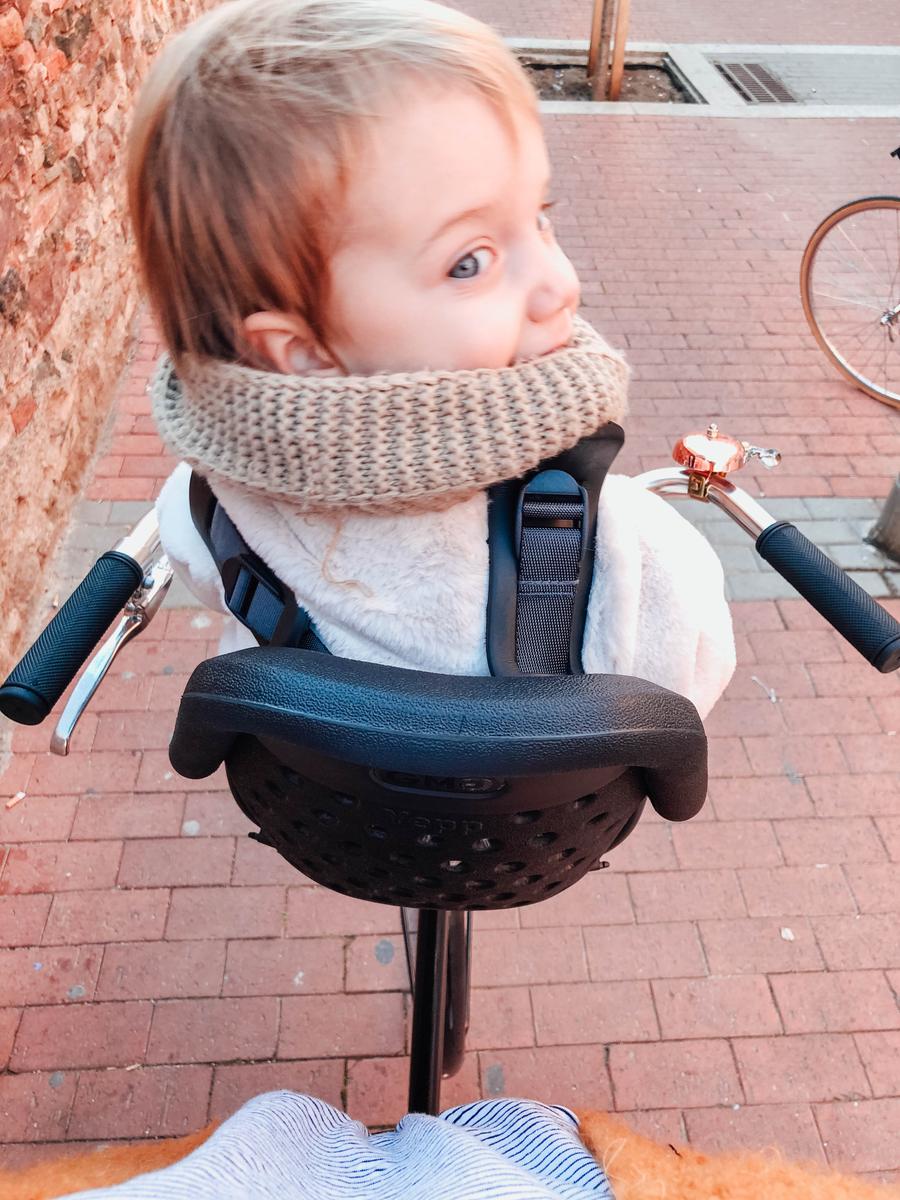 El modelo que nosotros tenemos es el Yepp mini de New Born Riders, y que además era la sillita que veíamos a todas partes cuando viajamos a Dinamarca y Holanda. La podéis ver aquí. Es posiblemente la mejor sillita para niños de bicicleta del mercado. Tiene muy buenos acabados, un gran diseño y es muy cómoda. La sillita se coloca en la potencia del manillar, y Valentina va en la parte delantera en una posición privilegiada.