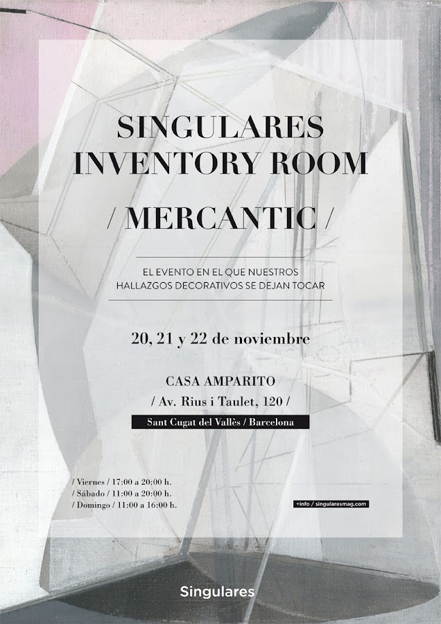 Singulares Inventory Room tendrá lugar desde el viernes 20 hasta el domingo 22 de noviembre en Casa Amparito, con 700 m2 y situado en el recinto de Mercantic, un conocido espacio que reúne cada fin de semana a centenares de amantes del vintage y el handmade. Quienes se acerquen al evento durante esos tres días podrán además saborear diferentes delicias gastronómicas presentes tanto en el espacio exterior e interior, ambos decorados para recrear un evocador jardín de invierno. La convocatoria se anuncia a través de un cartel, creado por la pintora Natalia Ribes, que simboliza la convergencia del mobiliario y, por extensión, de la decoración con el arte. En definitiva, habitar espacios que compartan nuestra personalidad es el propio arte de vivir, y encontrar las piezas que lo optimicen es el objetivo de Singulares Inventory Room.