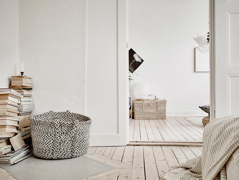 Para finalizar este “home-tour”, un par de vistas de detalle de la composiciones creadas con objetos cotidianos, una montaña de libros, un cesto, una mesita… si bien podría parecer que faltan muebles, eh aquí una prueba de que se puede vivir sin estanterías!