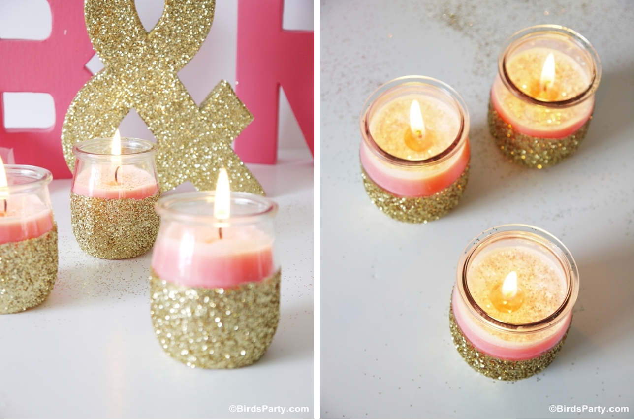 Un portavelas con purpurina dorada reciclando envases de cristal de yogures.....¿Te apuntas? Incluso puedes darle color en la cera de las velas. En el blog Birds Party te muestran el paso a paso.