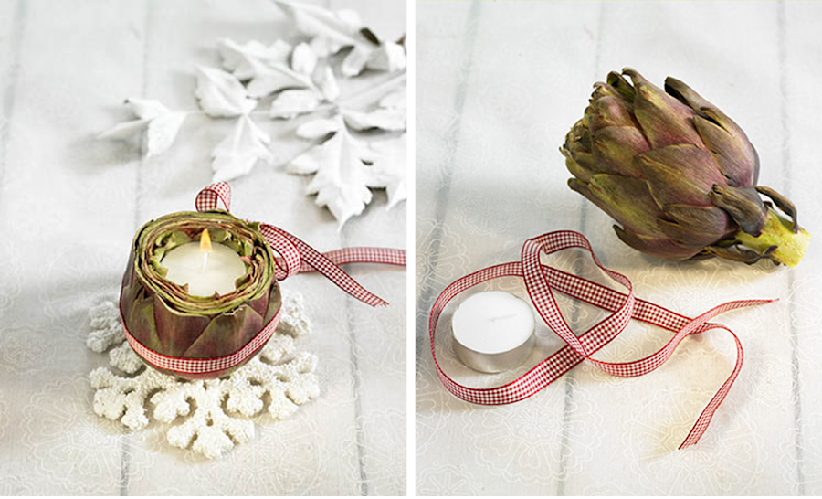 No, no ves mal, es una alcachofa. Delicooks nos sorprende con este portavelas con un vegetal, una velita y un lazo. La imaginación no tiene limites.