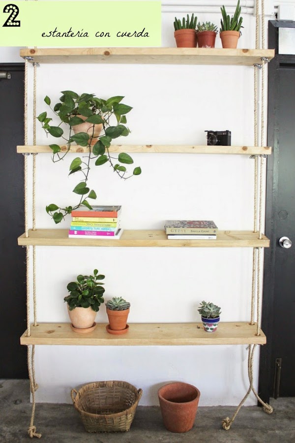 Esta otra, también muy fácil de hacer, de nuevo con tablones de madera, de la misma medida y cuerda. Los agujeros los podéis hacer con una broca de corte redondo para madera, yo la tengo y funciona estupendamente. El paso a paso, también en el blog A pair & a spare.