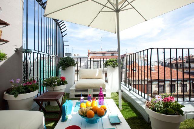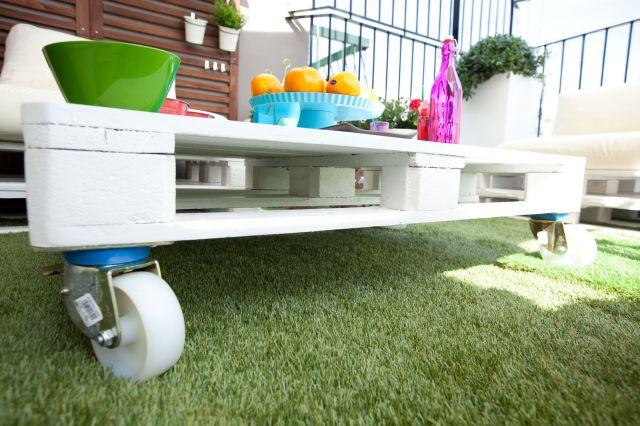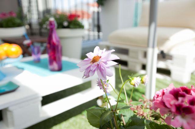 Además de instalar césped artificial en el suelo de la terraza y crear el mobiliario con palets, adquiriremos unas macetas grandes de diferentes alturas, para plantar las flores de primavera-verano que os he mencionado con anterioridad. También necesitaremos una gran sombrilla blanca para protegernos del sol en las horas centrales del día.