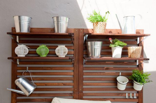 Si tienes una pared con la largura suficiente puedes colocar un panel trasero de madera, que te servirá como elemento decorativo, además si añades baldas puedes colocar algún pequeño tiesto o herramientas de jardinería. El de la imagen es de ikea Äpplarö.