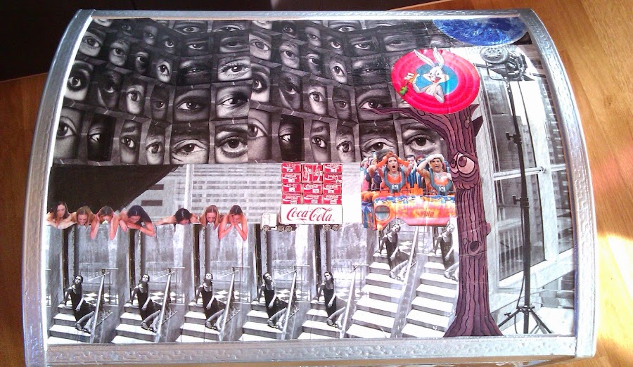 Necesitas revistas para reciclar, pintura, cola blanca, tijeras y un baúl. Empezamos pintando el baúl, yo elegí gris plata, recortar fotos que os gusten y tomar las medidas de las zonas donde queréis colocar los collages, para ir preparando la composición, cuando lo tengáis y la pintura este bien seca podéis empezar a pegarlo, y para terminar un par de capas de cola blanca cubriendo todo el collage.