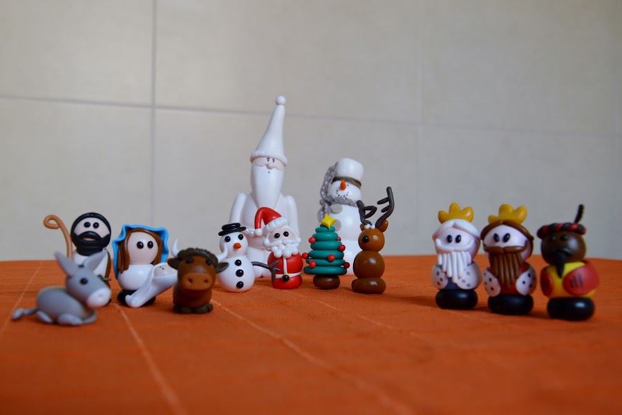 Puedes crear pequeños conjuntos (papa noel con un muñeco de nieve, un pequeño nacimiento con los tres reyes magos,..) o mezclarlo todo. Añade alguna vela para que destaque más.