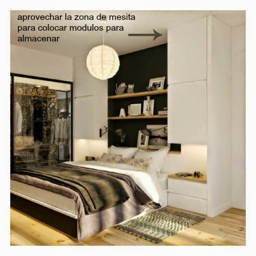 Aprovecha la pared del cabecero y pon armarios en la zona superior, si los pones del mismo color que la pared, no pesaran visualmente.