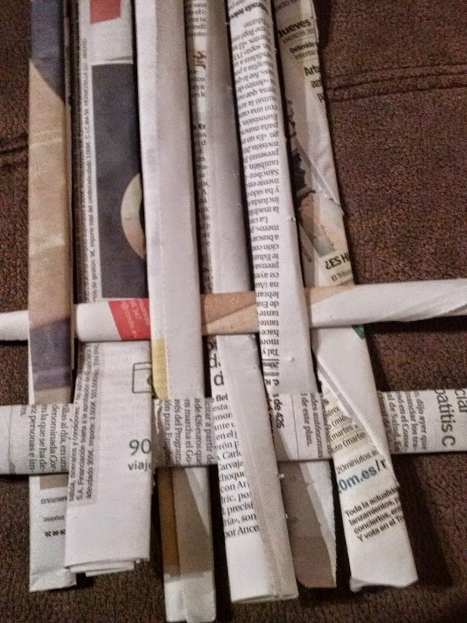 Cortaremos cada cara del periódico y haremos tiras con cada una de ellas. Las tiras las haremos enrollando cada cara en partes iguales, de forma parecida a una varita, pero aplastada. Si ponemos una página entera quedarán tiras muy gordas, por lo que es mejor cortar cada página por la mitad y trabajar solamente con caras del periódico, como se puede ver en la foto.