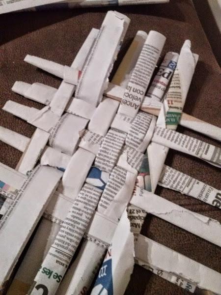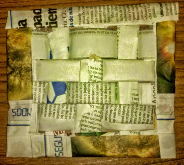 Cortaremos cada cara del periódico y haremos tiras con cada una de ellas. Las tiras las haremos enrollando cada cara en partes iguales, de forma parecida a una varita, pero aplastada. Si ponemos una página entera quedarán tiras muy gordas, por lo que es mejor cortar cada página por la mitad y trabajar solamente con caras del periódico, como se puede ver en la foto.
