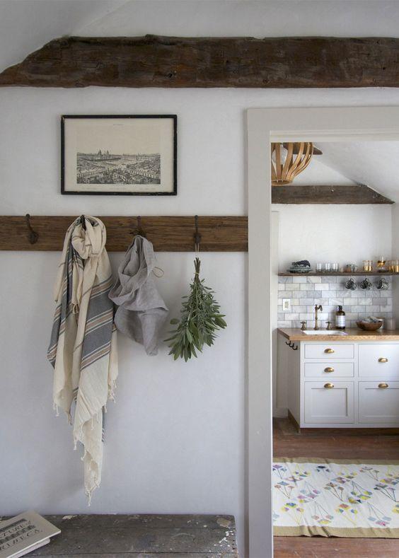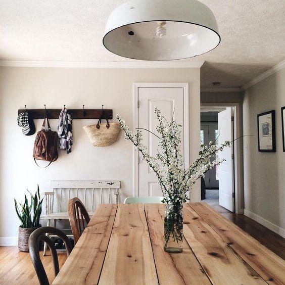 De nuevo, un aspecto rústico. Esta vez el recibidor de la casa da directamente al comedor, así que el banco y el colgador de madera resuelven perfectamente la función de entrada en la casa.