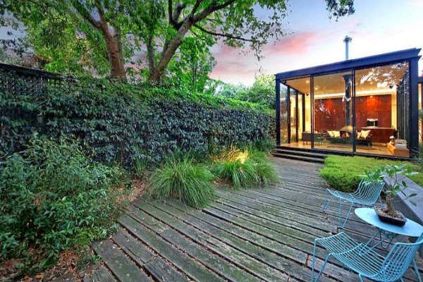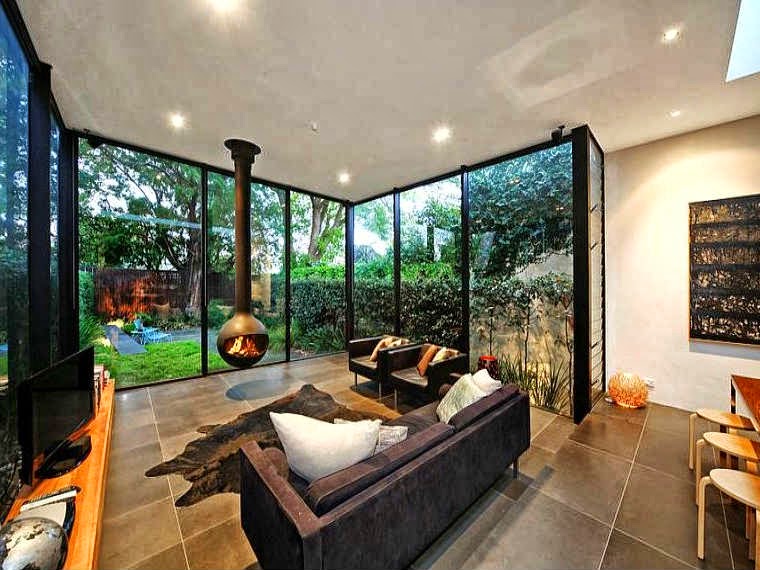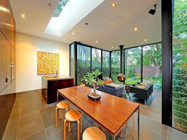 Destaca la sobria elegancia del pavimento escogido, las texturas y los elementos que conforman este salón y cocina que se sale de lo habitual. Perfectamente delimitados por unos escalones, ambos espacios interactuan y tienen total comunicación visual. El salón es una extensión de la casa que al reformarse se abrió totalmente al jardín con grandes cristaleras de suelo a techo. Al no quedar pared libre se optó por suspender la chimenea, importada directamente de Francia. Me gusta el efecto claroscuro que se consigue con los elementos oscuros suavizados tan sólo por la introducción de algunos muebles en madera clara y un detalle que puede pasar desapercibido, las paredes enfrentadas de la cocina lucen sendos cuadros, uno claro y otro oscuro, como para resaltar la linea que se sigue en todo el espacio. Muy original.