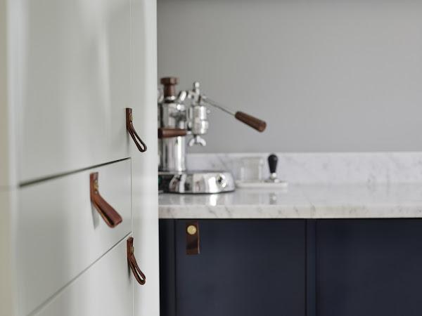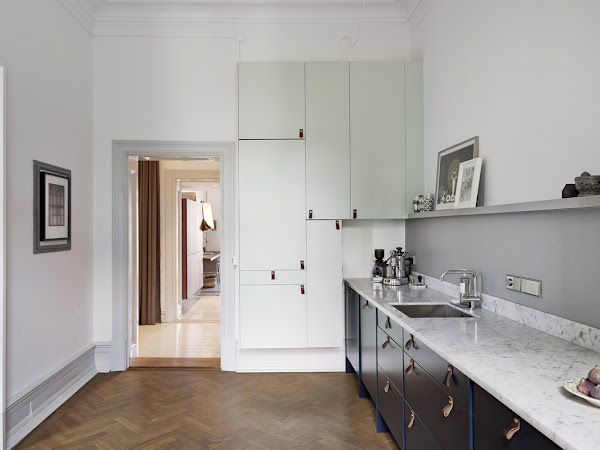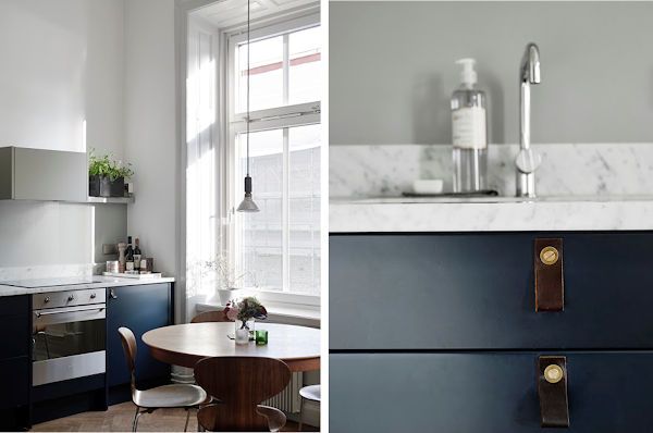 Si nos adentramos en la cocina, volvemos a encontrar colores neutros en su tono mas oscuro. Los muebles bajos de cocina son de un azul cobalto muy oscuro, con modernos tiradores de cuero y encimera de mármol blanca, ya os adelanté en este post que el mármol es un tendencia en auge. El conjunto creado por la mesa de comedor y sillas en madera de nogal, en tono similar a los tiradores de cuero, vuelve a conectar los elementos y mobiliario entre sí y además suaviza el binomio azul oscuro y blanco.