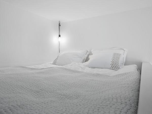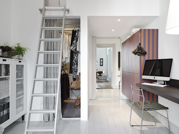 Es muy habitual que en los países nórdicos que los apartamentos de escasas dimensiones y techos altos aprovechen esa altura para crear un dormitorio en un sobre-techo. En este caso han distribuido un estudio en la planta y han colocado la cama en en sobre-piso, utilizando la zona baja del mismo para realizar un armario vestidor.