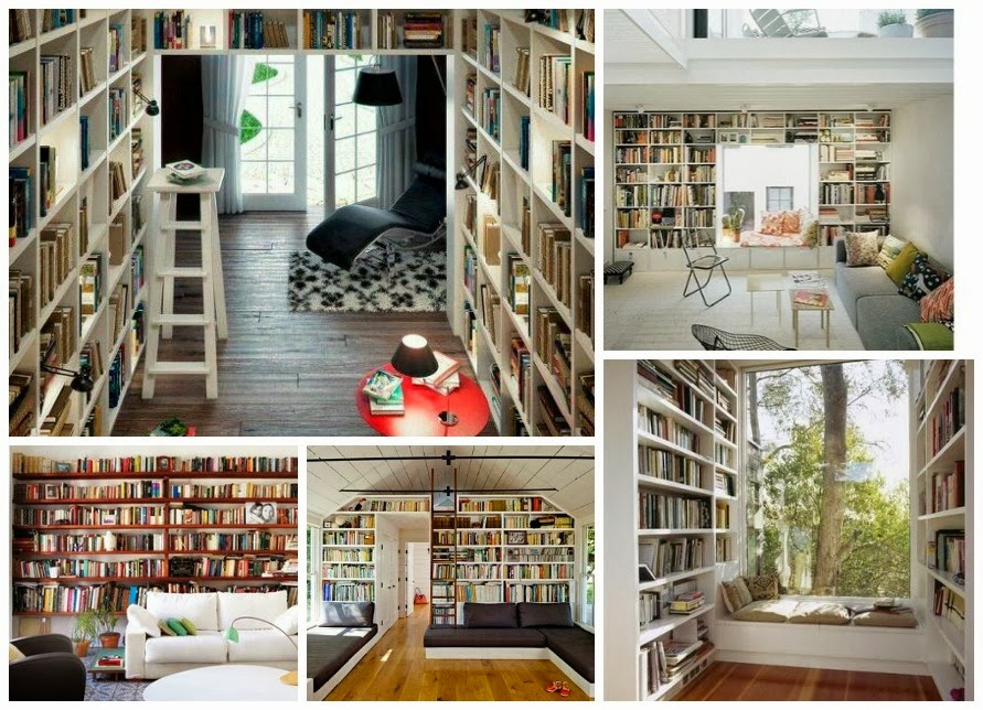 A mí es que se me cae la baba con estas cosas: paredes enteras y hasta el techo, que son librerías, LUZ, escaleras para llegar a todos los libros, cómodos sofás y sillas, personalidad de lector ávido de descubrir el seguiente libro...