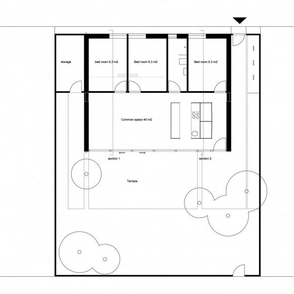 El edificio ocupa el área máxima permitida por la normativa local. Una partición divide el espacio en dos mitades, un amplio espacio abierto con la sala de estar y la cocina en la parte delantera y los tres dormitorios privados y el baño en la parte posterior. Una isla independiente separa esta zona del acceso y organiza el fregadero, la zona de cocción, la nevera y el almacenamiento, ocultando también así tuberías y otros elementos.