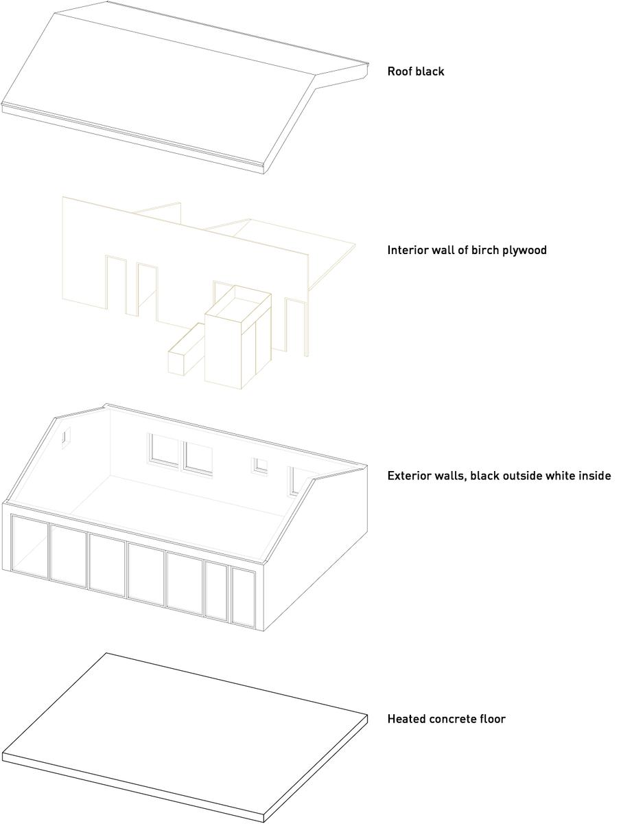La vivienda dispone de una sola planta, con la base de hormigón (con calefacción y refrigeración pasivas), cerramientos prefabricados de madera pintada de negro, ventanas de doble acristalamiento y cubierta a dos aguas. La pared orientada al sur se ha acristalado para maximizar la luz del sol en la casa, pudiendo en verano abrir toda la fachada y disfrutar de la terraza y del jardín como una extensión de la vivienda. En las fachadas este y oeste se añadieron pequeñas ventanas para coger la primera luz del alba y los últimos rayos de sol del atardecer. Por ello, aunque el exterior sea negro y oscuro, el interior es muy luminoso, con superficies pintadas de blanco y madera contrachapada.
