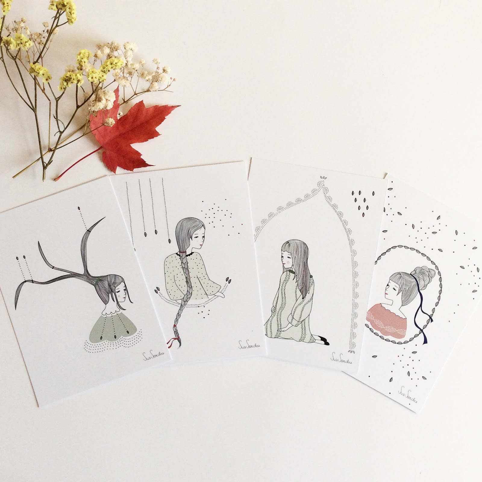 SUZSANCHEZESTUDIO: Sus ilustraciones no dejan indiferente a nadie. Estamos encantadas de sortear algo suyo, sobre todo, porque es "vecina" nuestra. Es una artista del diseño, y con estas 4 postales ilustradas, se puede ir al fin del mundo!