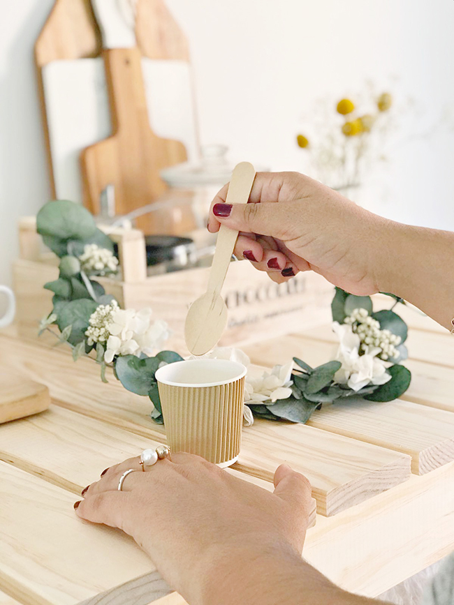 Luego puse la cafetera con todo lo necesario a mano. Es decir, azúcar, sacarina, unas cucharrillas y tazas o vasos de cartón (eran tan bonitos). Con esto ya tendríamos el rincón de café básico, aunque claro así solo era un poco sosete.