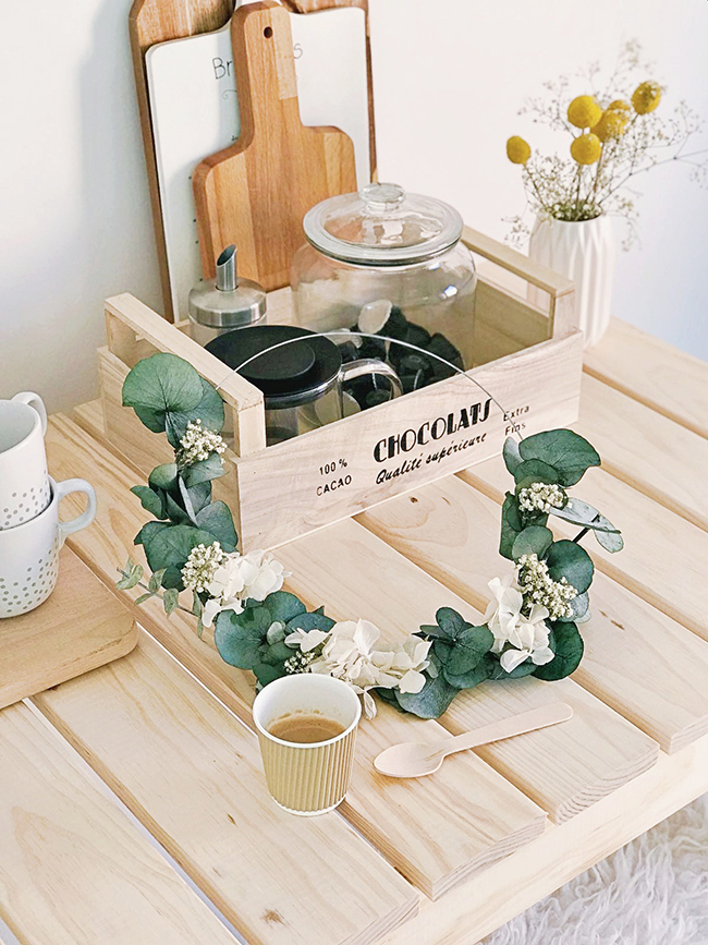 La decoración la terminamos con algunos botes de cristal, unas tablas de madera, una coronita de eucalipto preservado que hace que toda la estancia tenga un olor maravilloso... En definitiva, una decoración muy sencilla para que sea fácil de limpiar y se convierta en un espacio muy práctico y útil.