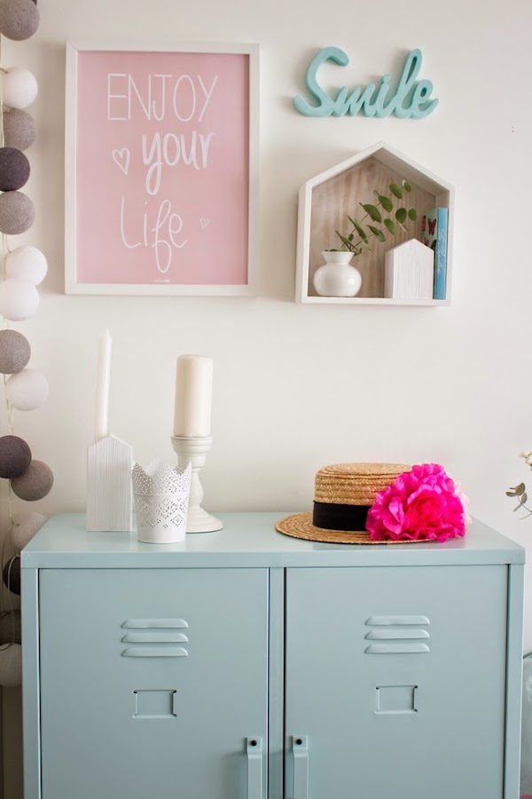 Supongo que en las fotos apreciaréis que es de metal, al principio me pareció atrevido pero una vez lo ví al natural me enamoró totalmente, además tiene baldas en el interior por lo que ahora ademas de decorativo tenemos espacio extra para guardar, manteles, servilletas y algunas cosas que en la estantería se quedaban a la vista y no me gustaba mucho el resultado.