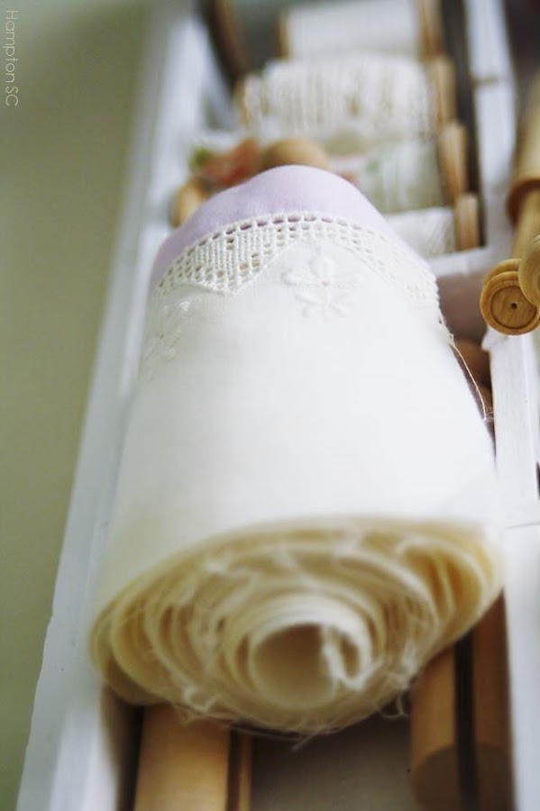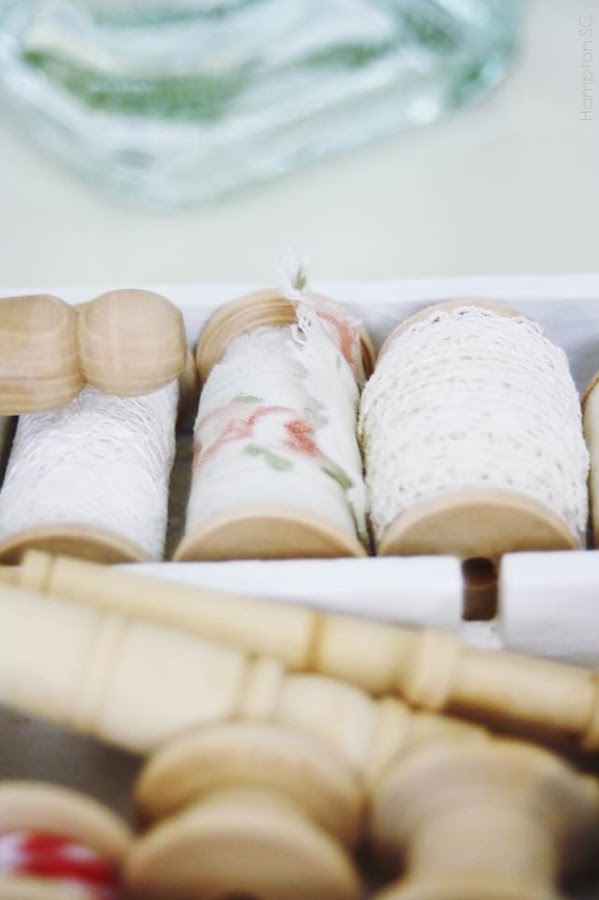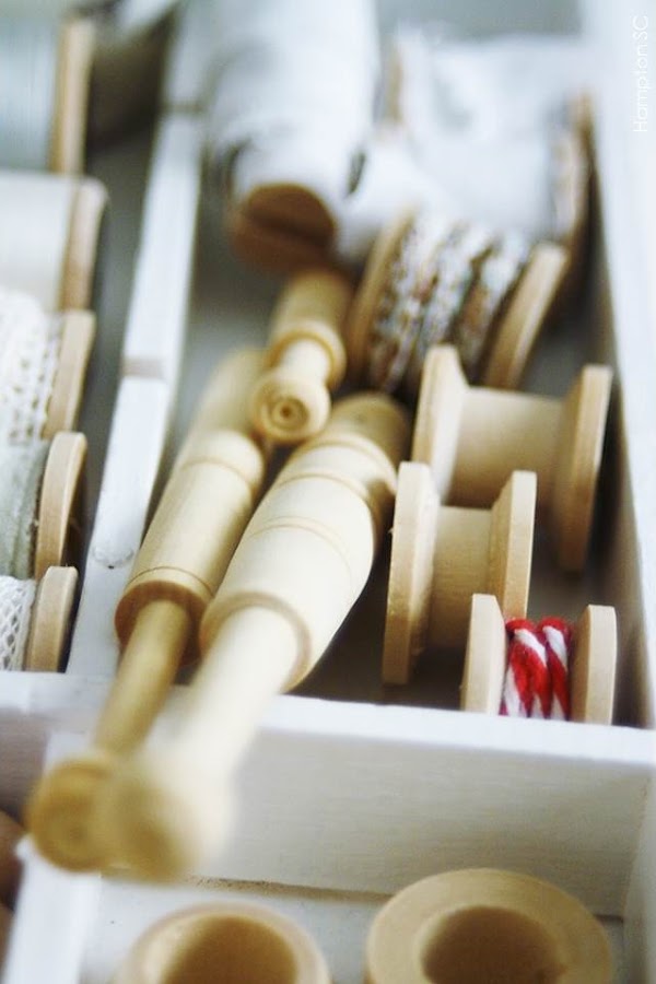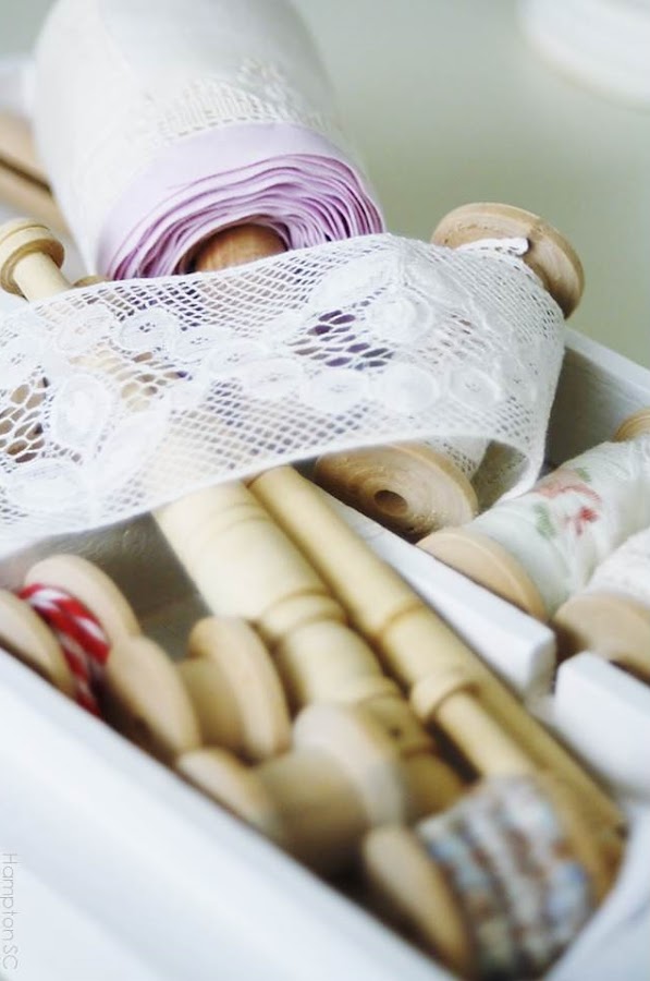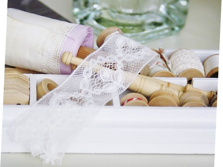 Madera, retazos de tejidos, hilos, encajes, bordados...