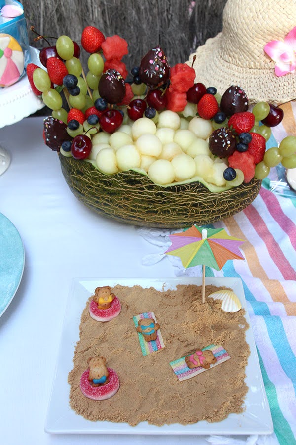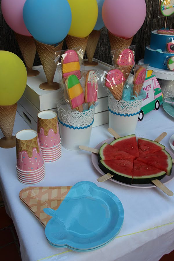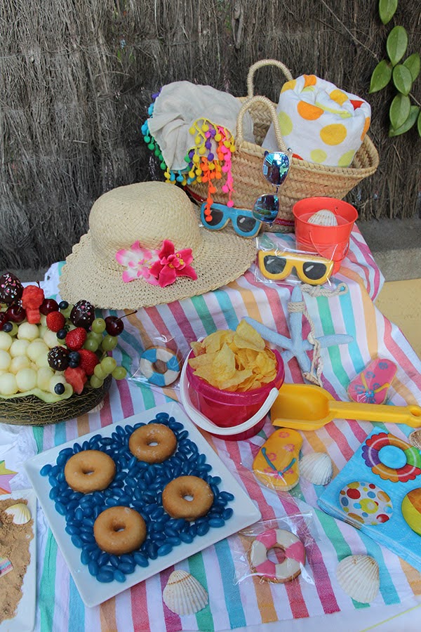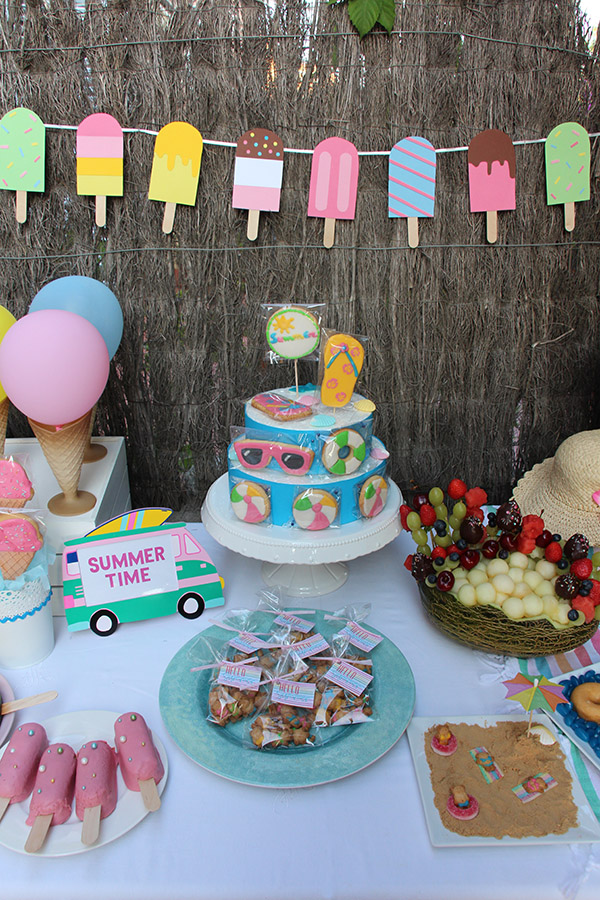 Podíamos haberla enfocado como una fiesta de helados, una pool party o una beach party, pero no!, nosotros queríamos una fiesta de verano global, donde estuviera representado todo lo que representa el verano, la playa, el sol, el mar, la piscina y los helados, ¡sí!!!!, de todos los tipos.Dividí la mesa en dos temáticas, una más enfocada al mar, los juegos en la arena, el disfrutar bajo el sol...