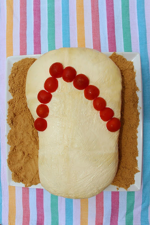 Hice un pastel de atún en forma de chancla, me parece gracioso tunear el pastel salado para incorporarlo a la temática de la fiesta, la manera de hacerlo lo tenéis explicado en este enlace