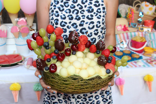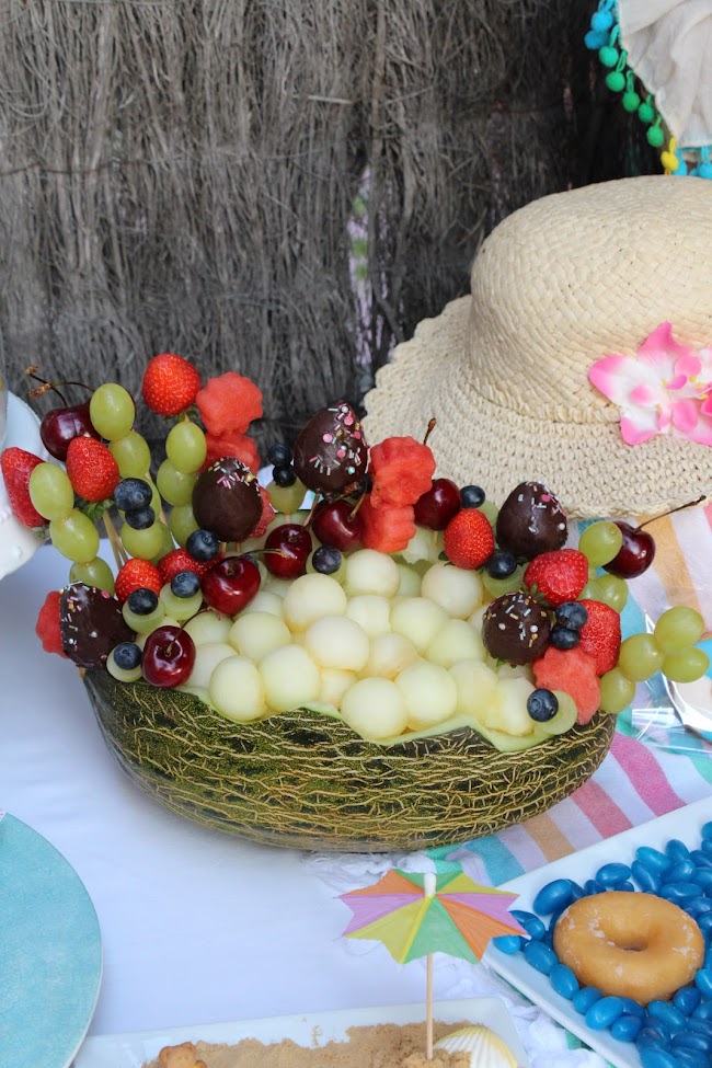 Hice un centro de frutas vaciando un melón y rellenándolo con bolas de melón, sandía, uvas, fresas, cerezas, arándanos y fresas de chocolate. No me digáis que no queda precioso y súperapetecible!